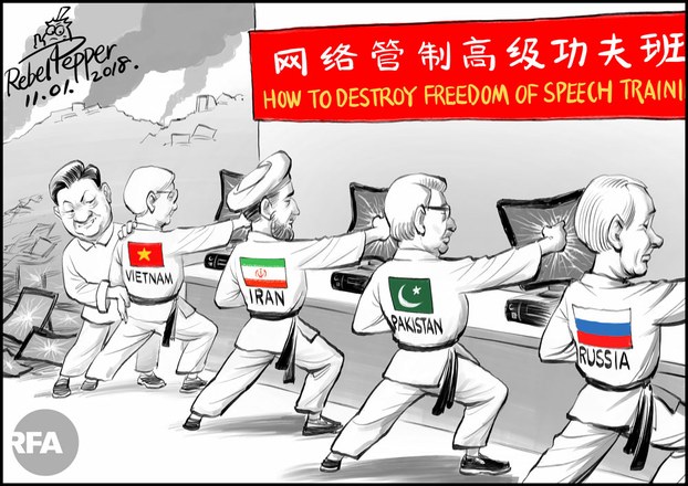 Tranh biếm họa: Lớp học đàn áp tự do báo chí do Trung Quốc đào tào Rebel Pepper/RFA