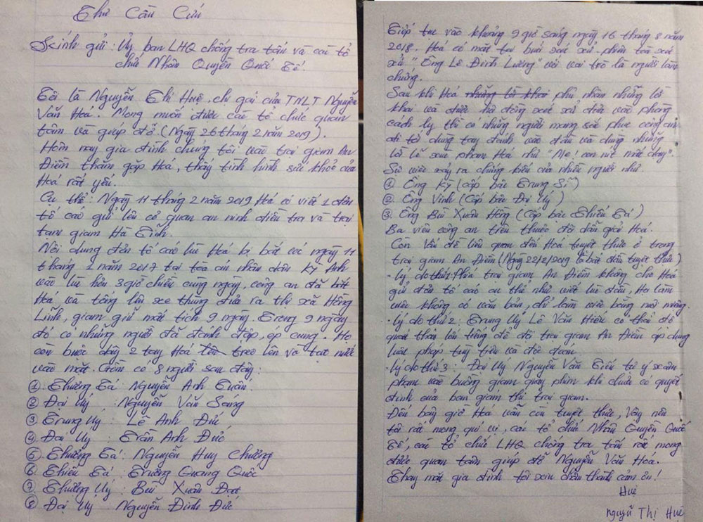 Ngày 24/10/2018, gia đình Hóa công bố bức thư của Nguyễn Văn Hóa viết hôm 19/9/2018, thông báo Hóa bị Phó giám thị trại giam công an tỉnh Nghệ An đánh đâp tại phòng cách ly của tòa án khi ra làm chứng tại phiên tòa một nhà hoạt động môi trường khác là ông Lê Đình Lượng tại Nghệ an hôm 16/8/2019. Lý do vì Hóa đã phản cung.